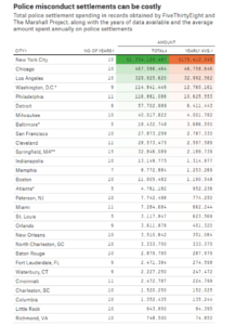 This supports research on police misconduct settlements conducted by Five Thirty Eight and the Marshall Project that found “$2.5 billion over 10 years — was spent by the nation’s three largest cities, which had a combined budget of around $115 billion last year alone. Smaller cities spent much less than New York, Los Angeles or Chicago, although a significant number, including Milwaukee, Detroit and San Francisco, still spent tens of millions of dollars on police misconduct settlements over the same period.”