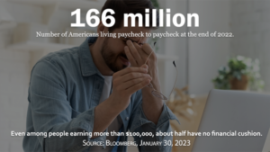 Consider that a recent national survey reported as 2022 came to an end “sixty-four percent of U.S. consumers (166 million) were living paycheck to paycheck…up 3 percentage points from 61% the year prior, with the most growth seen in higher income brackets…the shares of middle-income consumers (those earning between $50,000 and $100,000 annually) and low-income consumers (those earning less than $50,000 annually)… sit at 66% and 78%, respectively…The data also finds that an increasing number of consumers earning more than $100,000 are living paycheck to paycheck with difficulty paying their monthly bills. In December 2022, 16% of these high-income paycheck-to-paycheck consumers struggled to pay their monthly bills, up from 11% in December 2021.”